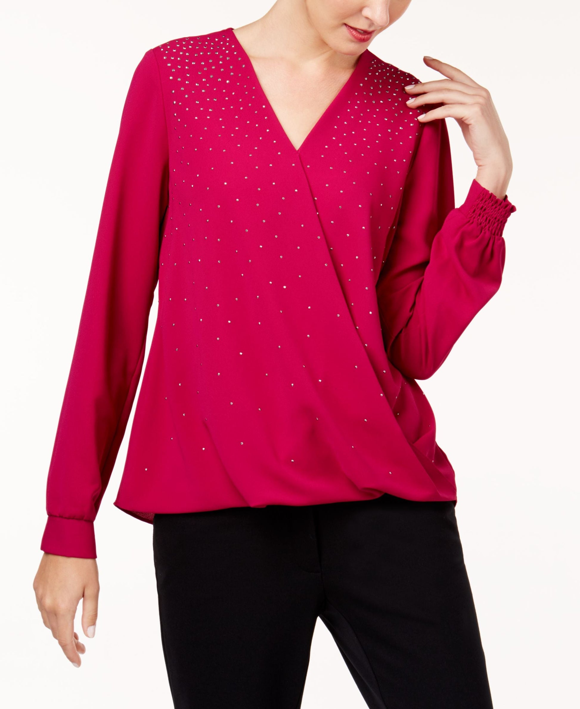 Surplice neckline Embellished; Soft Hits at hip Machine washable Imported