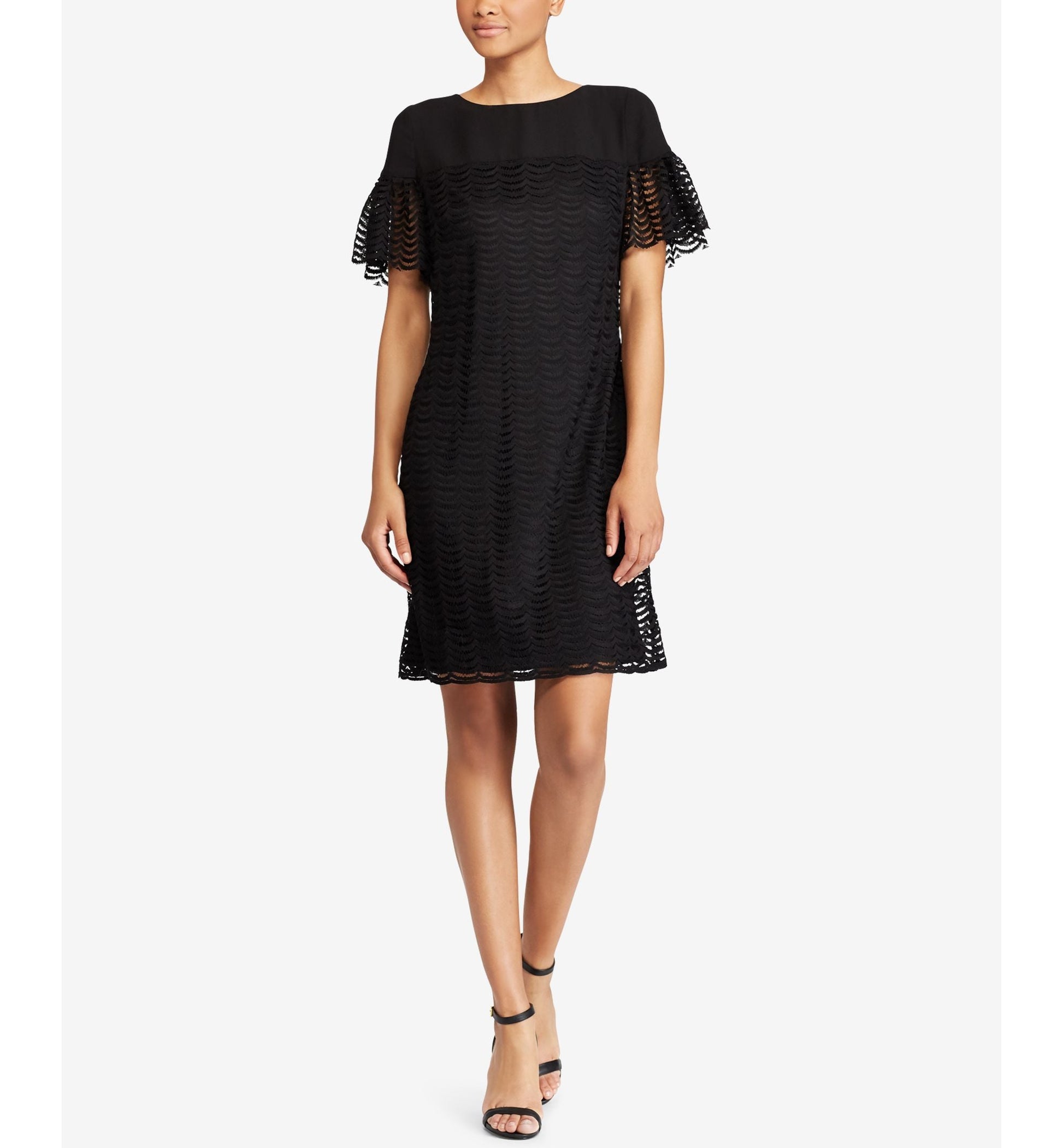Scalloped Lace Dress Scalloped lace and flutter sleeves lend a romantic look to this slim-fitting dress from American Living.