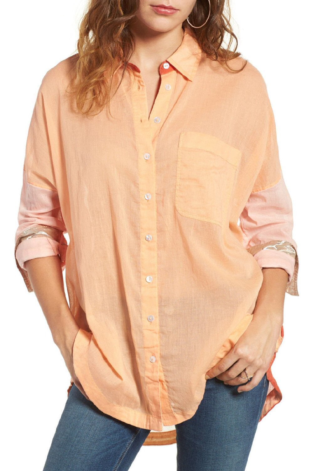 Roll up those sleeves and show off your colors with this gauzy cotton button-down top with a kaleidoscopic motif and an asymmetrical hem.