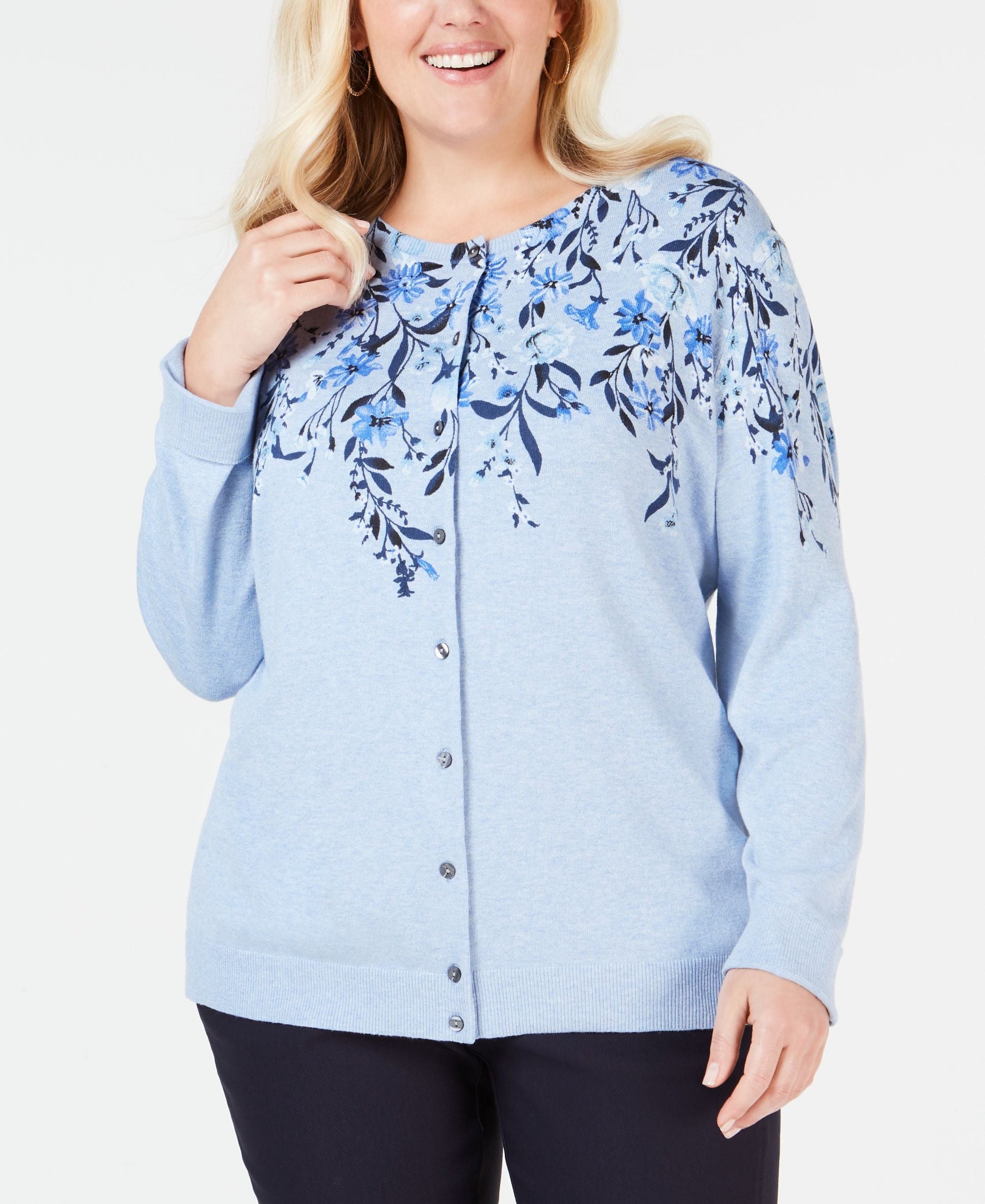 A lovely floral-print cascades down from the shoulders of this plus size cardigan from Karen Scott, a bright addition to your casual collection.