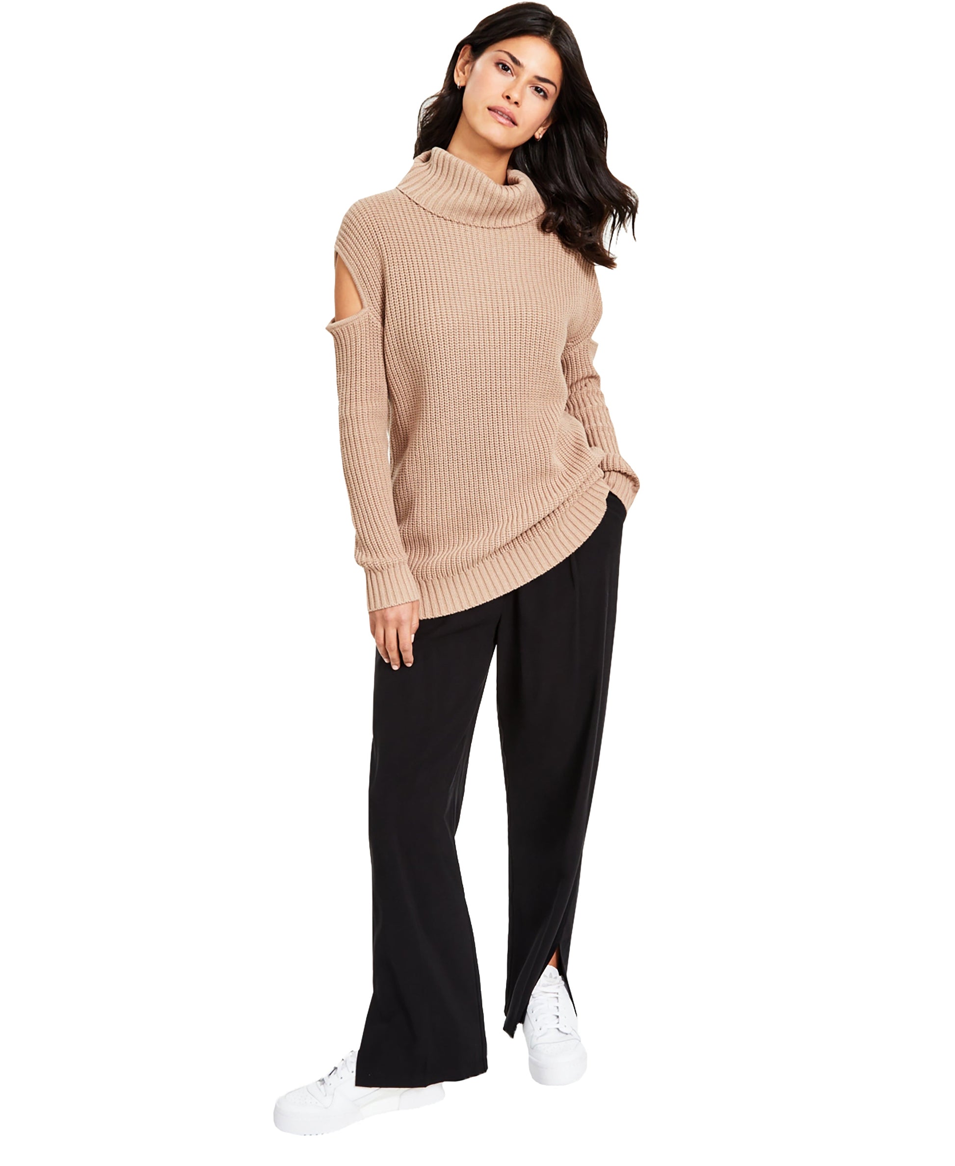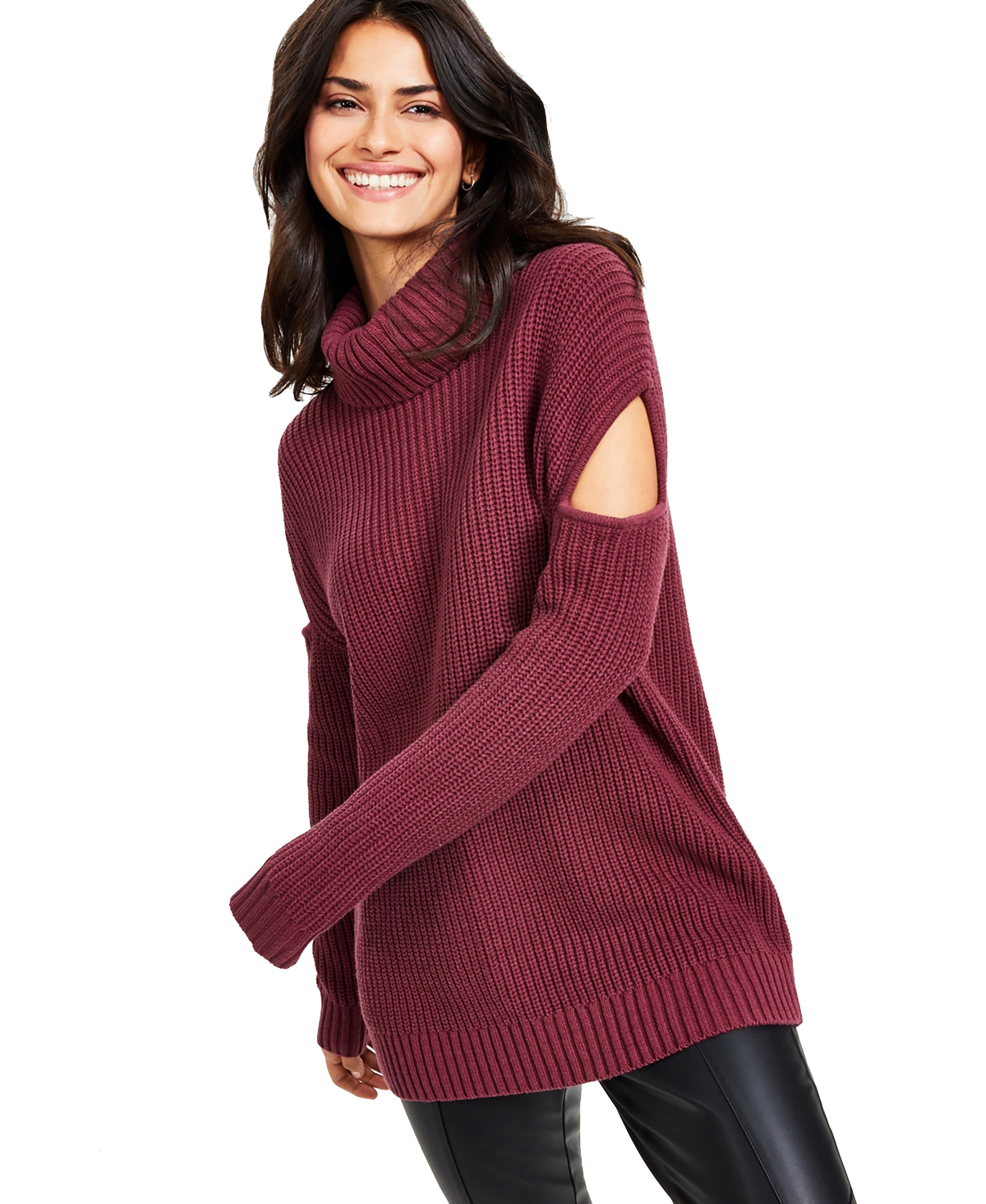 Bar III rethinks the turtleneck sweater, adding cutouts at the sleeves to a chunky knit for extra personality.